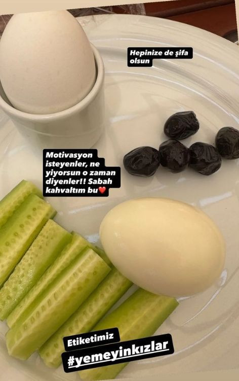 "Hepinize şifa olsun. Motivasyon isteyenler, ne yiyorsun o zaman diyenler. Sabah kahvaltım bu. Yemeyin kızlar" dedi.