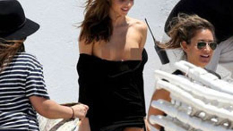 açıldı. Bir an ne yapacağını şaşıran Miranda Kerr göğüslerini