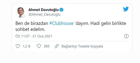 Türkiye'de de kullanıcı sayısı artan Clubehouse'a katılan ilk siyasetçi ise Gelecek Partisi Genel Başkanı Ahmet Davutoğlu oldu.