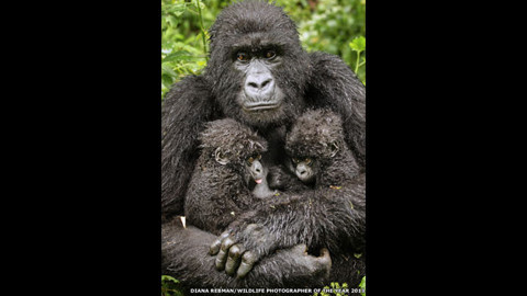 tehlikesi altında olan bu dağ gorili ve ikiz yavrularını