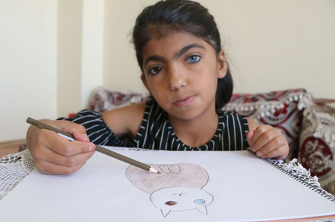 Van'ın merkez Edremit ilçesinde bulunan Mehmet Akif İnan İlköğretim Okulu 4'üncü sınıf öğrencisi Nurcan Berk, zekasıyla ve boyadığı sevimli resimlerle herkesi kendisine hayran bırakıyor. Bir gözü mavi, diğer gözü siyah olan Nurcan, boyadığı bütün resimlerdeki karakterlerin gözlerini, kendi gözleri gibi farklı renklerde boyuyor. 2 yıl önce öğretmeni tarafından boyaması için verilen resimlerdeki karakterlerin gözlerini kendi göz renginde boyayarak dikkatleri üzerine çeken Nurcan, takdir topladı. Küçük yaştan beri resim yapmaya merakı olan Nurcan, koronavirüs nedeniyle okulların kapanmasıyla birlikte şimdi çizimlerini evde yapıyor. 3 kardeşiyle birlikte evde çizim yapan Nurcan, okulunu özlediğini söyledi.Okulunu çok özledi Okulunu çok özlediğini söyleyen Nurcan, "Okullar pandemi nedeniyle şu anda kapalı. Ben de okulda çizdiğim resimleri şimdi evde çiziyorum. Yani hayallerimi evde süslüyorum. Yaptığım resimlerdeki karakterlerin gözlerini, aynı kendi gözlerim gibi boyuyorum. Okulumu çok özledim. Büyüyünce hayalim olan resim öğretmeni olmak istiyorum" dedi.Hayali resim öğretmeni olmak Görme engelli olan baba Yusuf Berk ise, ‘’Nurcan'ın hayalinde resim öğretmeni olmak var. İnşallah büyüyünce o hayaline kavuşur. Şu anda okulların kapalı olması nedeniyle hayallerini evde süslüyor" diye konuştu.