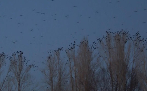 Galerinin tamamı için tıklayınızAkşam saatlerine doğru ortaya çıkan yüzlerce karga, bir süre havada toplu halde sağa-sola uçup, havanın kararmaya başlamasıyla birlikte evlerin çevresindeki ağaçlara konuyorlar.