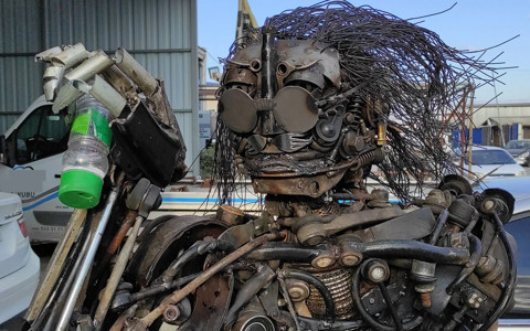 Galerinin tamamı için tıklayınızDüzce Küçük Sanayi Sitesi’nde bulunan bir otomobil tamirhanesinde motor ustası olarak çalışan Murat Çetin, tamir edilen otomobil parçalarını toplayarak daha önce birisi savaşçı, birisi gitar çalan rock müzik sanatçısına benzeyen iki metal heykel yaptı.