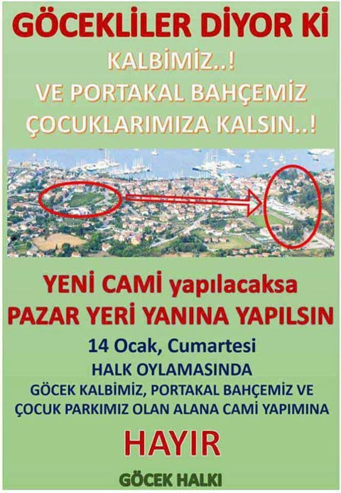 Galerinin tamamı için tıklayınızAyrıca, kaza, yangın, deprem ve benzeri afet olayların önlenmesi sırasında merkeze giriş/çıkış ve diğer lojistik zorlukları da meydana getirebilecektir. Yaşanılan kentsel mekanı, yalnızca yollar, kaldırımlar, binalar ve diğer fiziksel donatılanlarla tanımlamak yetmez. Kentin hafızaları büyük bir titizlikle korunarak, bir arada yaşam bilinci pekişir. Tarih yalnızca yazılı belge olmanın dışında, yaşamsal ve görsel süreklilik olarak toplum bilincine mal edilir. Beldemiz kentsel belleğinin her gün biraz daha yok olduğu süreçte, son birkaç hafıza mirasından biri olan portakal bahçemizin inşaata açılarak yok olması bu bağlamda hatıraların da yok olmasına yol açacaktır. Özetle bu yeşil alanın herhangi bir inşaata açılması, Göcek"in en önemli simgelerinden birisini ortadan kaldıracak, hatıraları yok edecek, yoğunluk ve lojistik sorunları yaratacak, beldenin marka değerini azaltacak ve uzun yıllar eleştiri konusu olacaktır."