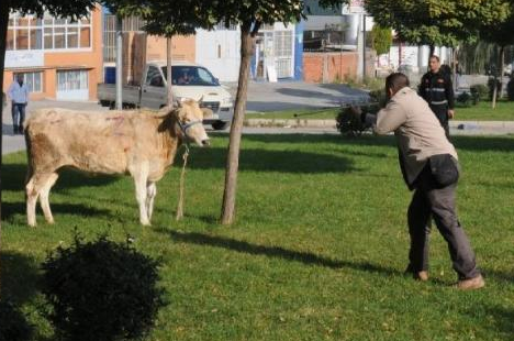 Yaklaşık iki saat süren kovalamacanın ardından dana, çağrılan belediye ekiplerinin tüfekle attığı iki uyuşturucu iğne ile etkisiz hale getirildi.