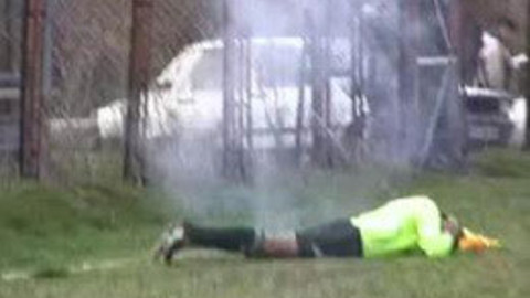 eden yan hakem Fikret Başaran yere yığılıp kaldı. Maçın orta hakemi