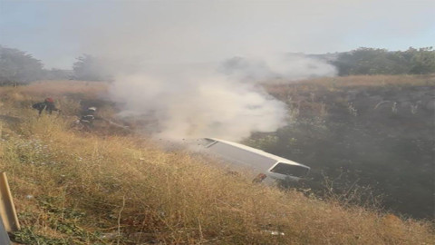 Yanmaktan son anda kurtuldular! Şarampole yuvarlanan minibüs alev aldı