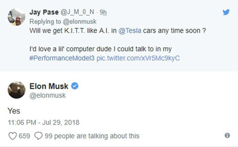 Sosyal medyada bir kullanıcının "Yakında Tesla otomobillerde K.I.T.T gibi bir yapay zekaya sahip asistanımız olacak mı?" sorusuna Musk "Evet" yanıtını verdi.