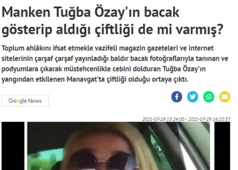 Galerinin tamamı için tıklayınızToplum ahlakını ifsat etmekle vazifeli magazin gazeteleri ve internet sitelerinin çarşaf çarşaf yayınladığı baldır bacak fotoğraflarıyla tanınan ve podyumlara çıkarak müstehcenlikle cebini dolduran Tuğba Özay’ın yangından etkilenen Manavgat’ta çiftliği olduğu ortaya çıktı.”