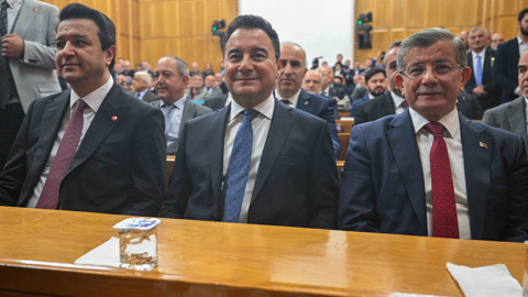 Grup toplantısı öncesi kürsüye "Yeni Yol" yazısı asılırken, kürsünün arkasında ise DEVA, Gelecek ve Saadet Partisi'nin bayrakları yer aldı.