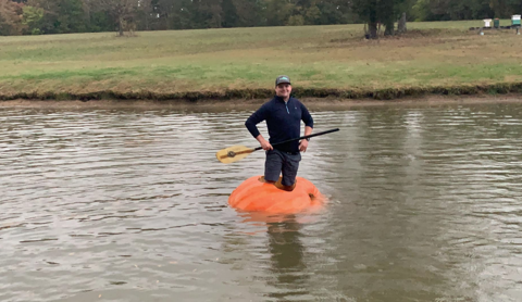 Ownby, dev balkabağından tatlı veya başka bir şey yapmak yerine içini oyarak bot yaptı.