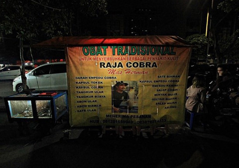 Başkent Cakarta’nın batısındaki Mangga Besar'da akşam saatlerinde kobra yılanı tezgahları kuruluyor.