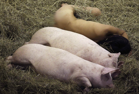 Galerinin tamamı için tıklayınız2010 yılında 'The Pig That Therefore I Am' adını taşıyan performansı için 4 gün boyunca domuz çiftliklerine gidip çıplak fotoğraf çektiren sanatçı bu kez 104 saat domuzlarla birlikte yaşayacak.