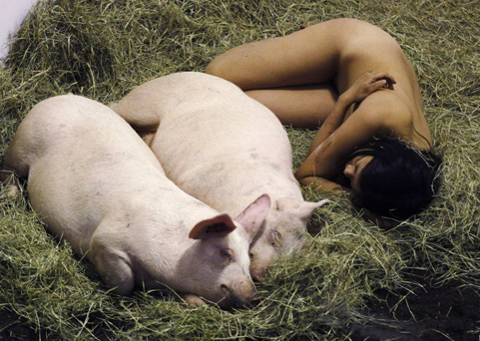 Galerinin tamamı için tıklayınızKim, politik bir amaç taşımadığını, bu performansı sadece en çok sömürülen hayvanlar olarak gördüğü domuzlara dikkat çekmek için yaptığını ve Fransız filozof Michel Serres'in 'Les Cinq Sens' (Beş Duyu) kitabından etkilendiğini söylüyor.