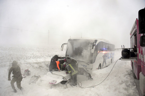 Tokat'ta şehirler arası yolcu otobüsünün otomobile çarpması sonucu aynı aileden bir kişi öldü, iki kişi yaralandı. Tokat Yıldızı firmasına ait Cengiz Günder'in kullandığı 60 DN 343 plakalı yolcu otobüsü, kar ve tipinin etkili olduğu Tokat-Sivas karayolunun Yatmış köyü yakınlarında, yolun sağında bekleyen Mustafa Bozdemir idaresindeki 60 BP 331 plakalı otomobile çarparak yaklaşık 50 metre sürükledi. Kazada, sürücü ile babası Murat ve annesi Zeynep Bozdemir otomobilde sıkıştı. AFAD, Tokat Belediyesi itfaiye ekiplerinin 45 dakikalık çalışması sonucu sürücü ve babası araçtan yaralı olarak çıkarılarak kentteki hastanelerde tedavi altına alındı. Olay yerinde yaşamını yitiren Zeynep Bozdemir'in cesedi, araçtan çıkarılarak otopsi yapılmak üzere Tokat Devlet Hastanesi morguna kaldırıldı. İşte olay yerinden görüntüler...