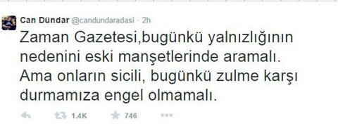 Türkiye bu pazar sabahına yeni bir operasyon haberiyle uyandı. Polis, çok sayıda çevik kuvvetin desteğiyle Zaman gazetesinin Yenibosna'daki merkezine baskın düzenlerken, bazı dizi yapımcıları da sabahın erken saatlerinde gözaltına alındı. Gözaltına alınanlar arasında Zaman Gazetesi Genel Yayın Yönetmeni Ekrem Dumanlı da bulunuyor. Bazı gazeteciler Twitter'dan operasyonla ilgili olarak değerlendirmelerde bulundu. İşte, operasyona ilişkin tweet atan o gazeteciler: 2011 yılında Ergenekon soruşturması kapsamında 1 yılı aşkın süre tutuklu kalan gazeteci Ahmet Şık bugünkü 14 Aralık operasyonuyla ilgili olarak Twitter’dan açıklamalarda bulundu. Ahmet Şık'ın bu tweet'ine Zaman Gazetesi cephesinden ilginç yanıtlar geldi. Zaman Washington temsilcisinden yanıt Ahmet Şık’ın tweetine kısa bir süre sonra Zaman Gazetesi Washington temsilcisi Ali H. Aslan’dan cevap geldi. Aslan Şık’a “Faşiste faşist dediğin için teşekkürler Ahmet Şık. Ve lütfen hakkını helal et. Biz senin özgürlüğüne böyle sahip çıkamamıştık” cevabını verdi.