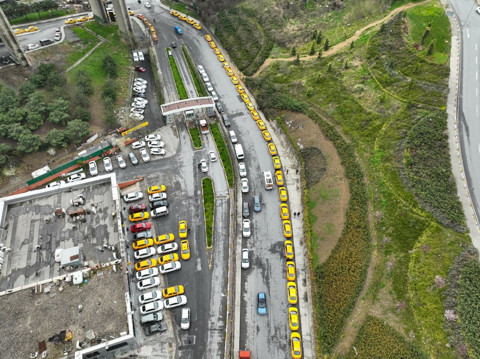Taksicilerin oluşturduğu uzun kuyruklar havadan görüntülendi.