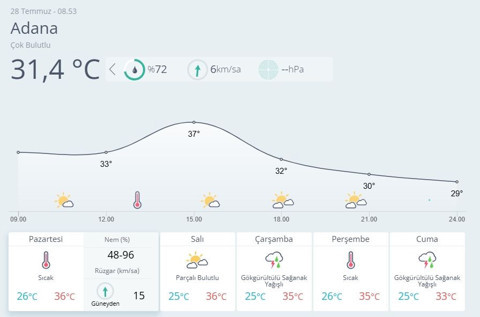 Meteoroloji Genel Müdürlüğü tarafından yapılan tahminlere göre: Doğu kesimlerin parçalı bulutlu, Doğu Akdeniz'in Toroslar kesiminin yerel olmak üzere sağanak ve gök gürültülü sağanak yağışlı, diğer yerlerin az bulutlu ve açık geçeceği tahmin ediliyor. Doğu Anadolu ile Güneydoğu Anadolu’da toz taşınımı bekleniyor. Hava sıcaklığının ise iç kesimlerde 3 ila 5 derece artacağı, Ülkemiz genelinde mevsim normalleri üzerinde seyretmeye devam edeceği tahmin ediliyor.ORHAN ŞEN UYARDI Bu senenin 4. sıcak hava dalgası önümüzdeki hafta boyu iç kesimlerde etkili olacak. Sıcaklıklar ortalama 6-7 derece üzerine çıkacak. Ankara, Sivas, Denizli, Manisa, İzmir, Balıkesir, Sakarya ve kıyı bölgeler etkilenmeyecek. Uzun aradan sonra Çarşamba günü Marmaranın kuzeyinde cuma günü Marmara, Doğu ve Batı Karadeniz ve İç Anadolu'nun kuzeyinde yağış görünüyor.