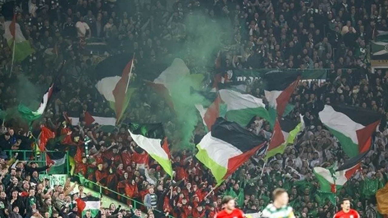 İspanya ekibi Athletic Bilbao taraftarları, İngiltere temsilcisi Arsenal ile oynanan UEFA Şampiyonlar Ligi ilk hafta maçında Filistin'e destek pankartı açtı.