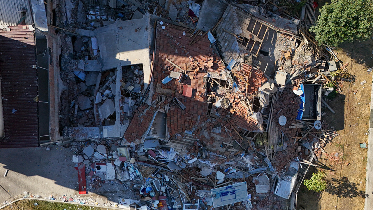 Ekipler, binanın enkazından çıkan molozları iş makineleriyle kamyonlara yüklendi. Bölgedeki enkaz kaldırma çalışmaları AA ekibince dronla görüntülendi.