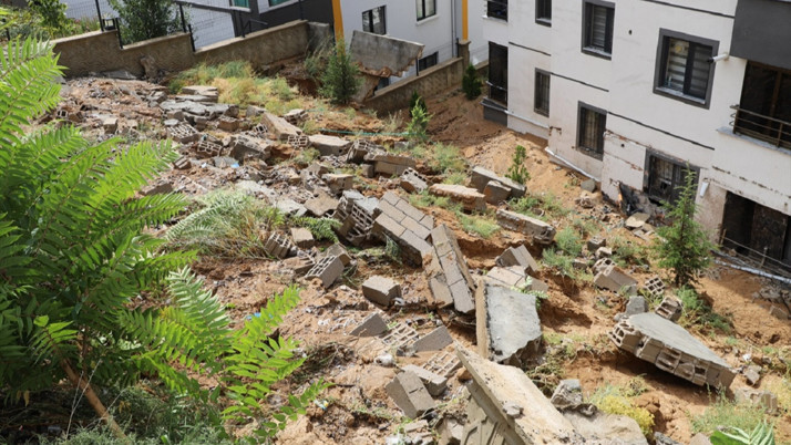 Yağış nedeniyle Gölbaşı ilçesindeki Seğmenler Mahallesi 978. Sokak'ta bulunan bir binanın istinat duvarı yıkıldı.