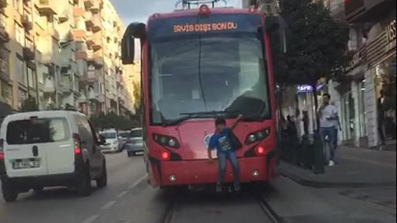 Bursa’da tramvayın arkasına asılan küçük çocuk, ölümü göze alarak yolculuk yaptı. Akıllara durgunluk veren görüntü Bursa’nın en kalabalık caddelerinden olan Altıparmak'ta kameralara yansıdı.