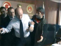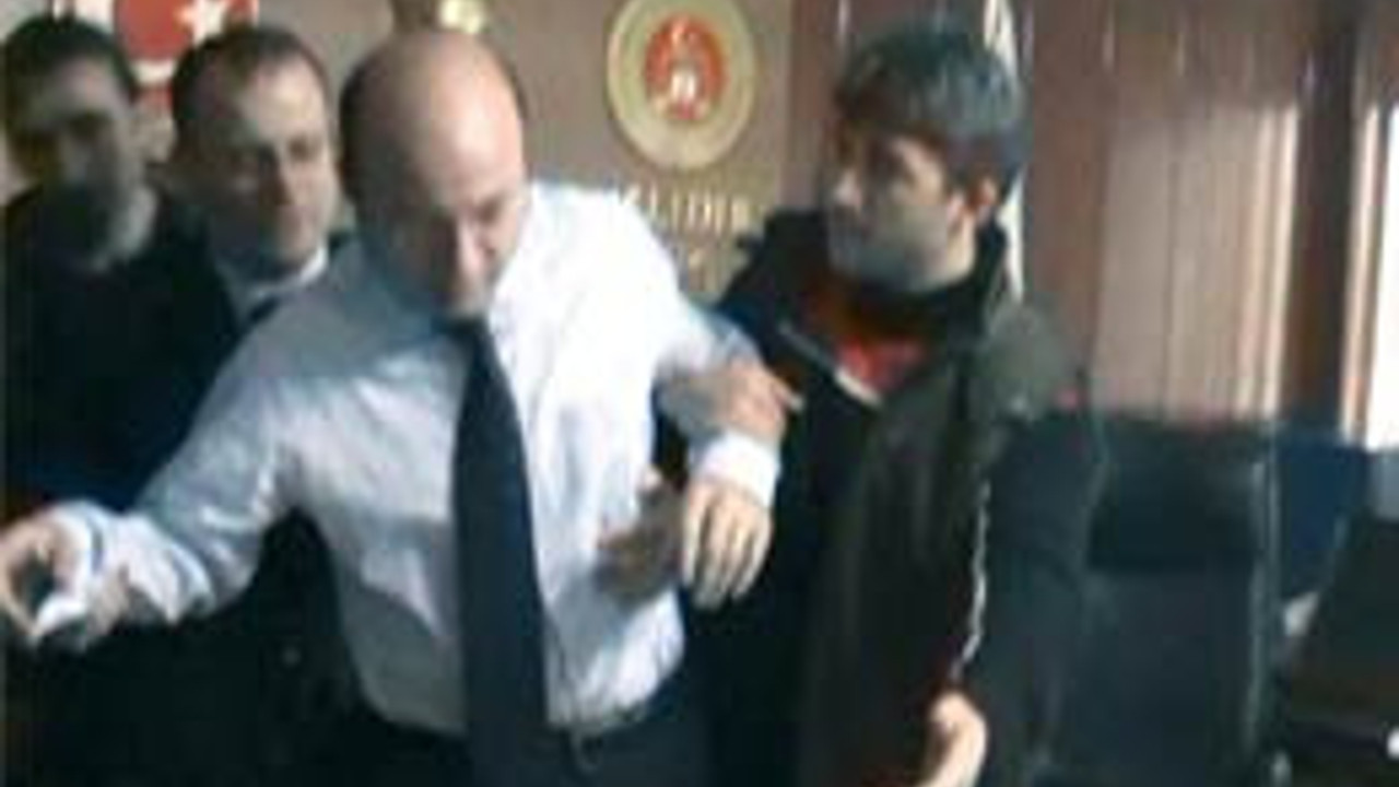 Abone olEski Erzincan Başsavcısı İlhan Cihaner adliyedeki makam odasında gözaltına alınmasına karşı çıkınca polisler Cihaner'in kollarına girerek zorla götürüyorlar.