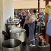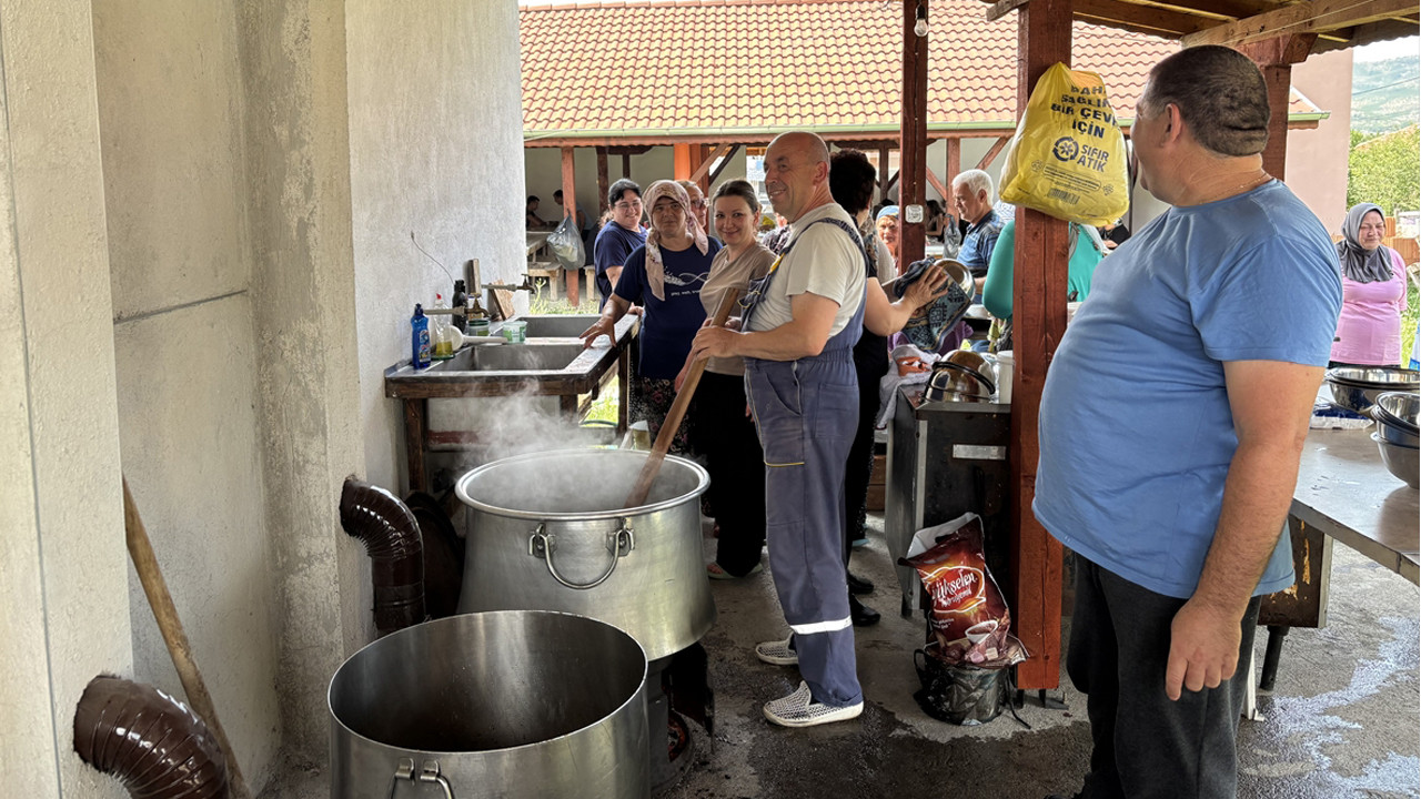Cami önünde kurulan kazanlarda bağışlanan kurban etleri pişirilip tüm köy halkına eşit bir şekilde dağıtılıyor.
