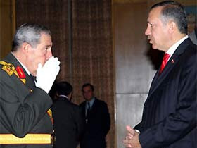 Erdoğan ile Büyükanıt resepsiyonda buluştu. İkili konuşurken Paşa ağzını ,eliyle kapattı.