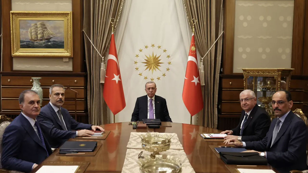 Toplantıya Cumhurbaşkanı Erdoğan'ın yanı sıra Dışişleri Bakanı Hakan Fidan, Millî Savunma Bakanı Yaşar Güler, Millî İstihbarat Teşkilatı Başkanı İbrahim Kalın ve AK Parti Sözcüsü Ömer Çelik katıldı.