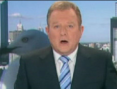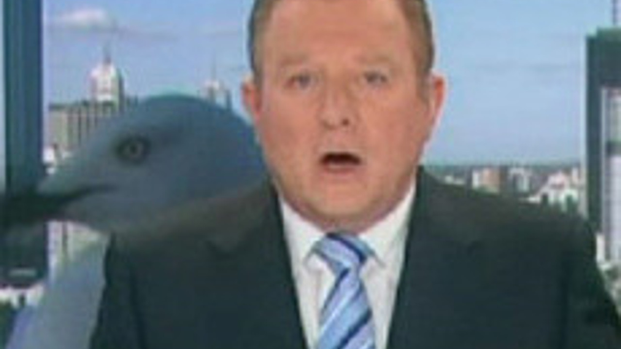 Peter Hitchner gayet ciddi bir şekilde haberleri sunarken, kameralar tarafından büyütülmüş dev beyaz bir martı sunucunun arkasından geçiveriyor....