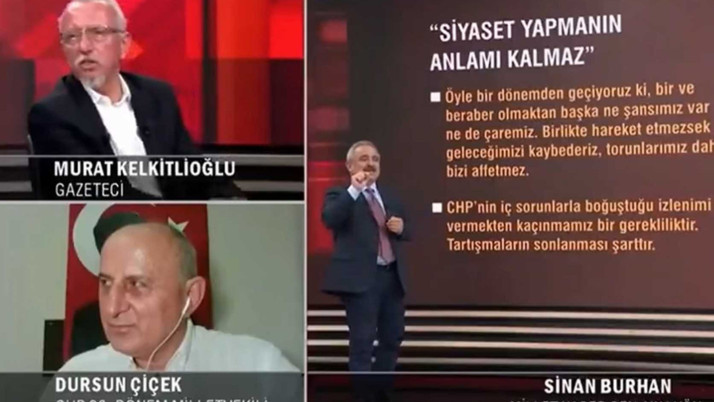 Eski CHP Milletvekili Dursun Çiçek, tv100’de katıldığı yayında gazeteci Sinan Burhan’a yönelik dikkat çeken ifadeler kullandı. "CHP iktidara gelirse televizyonlar kapanacak" imasında bulunan Çiçek, Burhan’a "yeni iş arayın" dedi; Burhan ise bu sözlere sosyal medya hesabından “tehdit” diyerek tepki gösterdi.