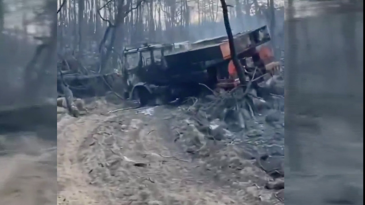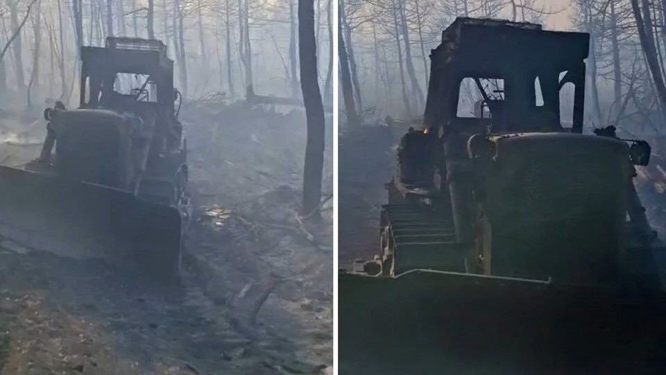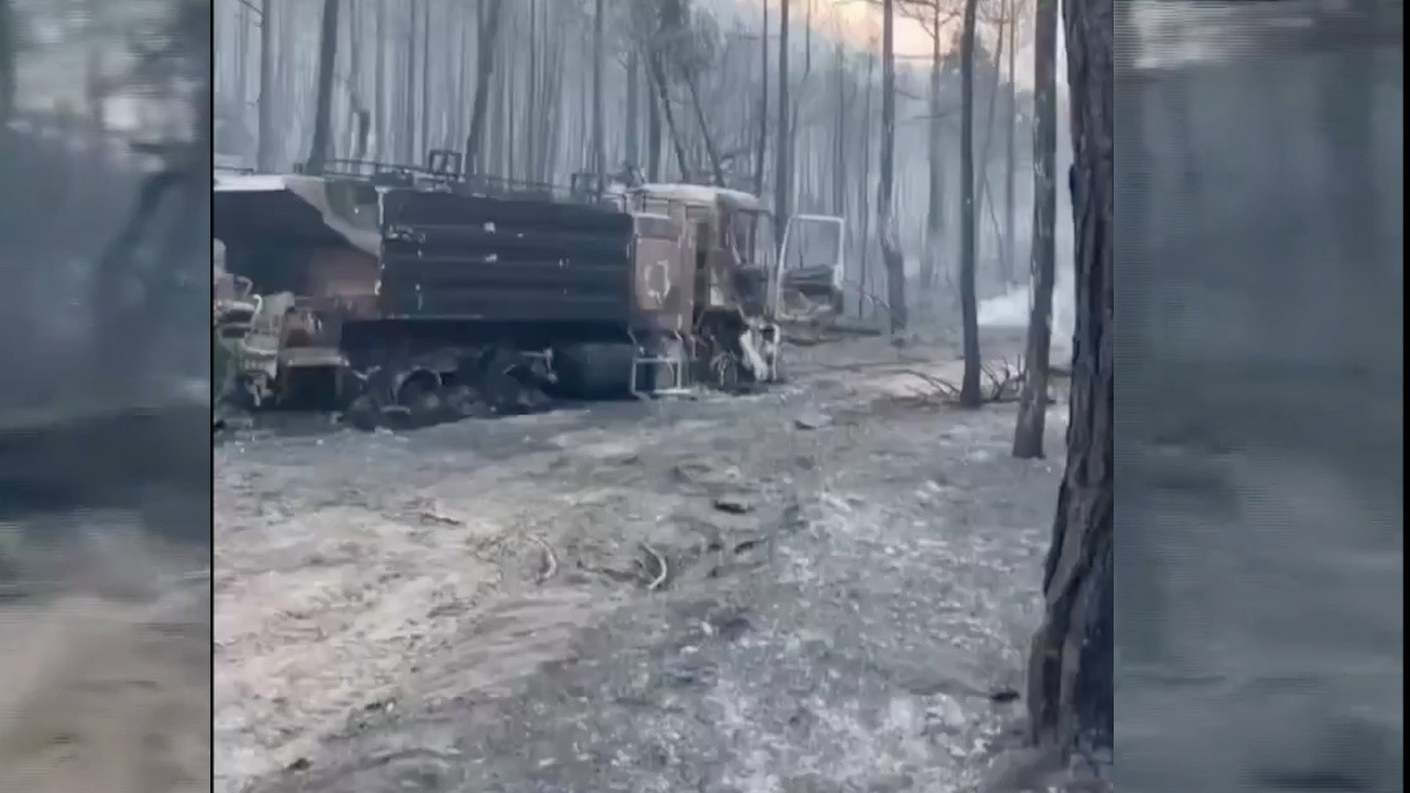 Eskişehir'de orman yangınında alevlerin arasında kalarak 10 kişinin şehit olduğu alan ve aynı yangında şehit olan Eyüp Dereli'nin kullandığı iş makinesinin son hali görüntülendi. İş makinası hala yanmaya devam ediyordu.