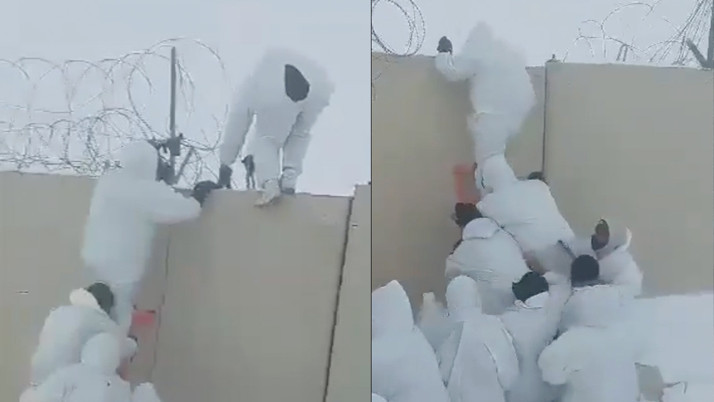 Görüntülerde, beyaz giyinmiş kalabalık bir grubun kar yağışı altında beton bariyerleri aştıkları görülüyor.
