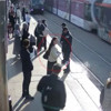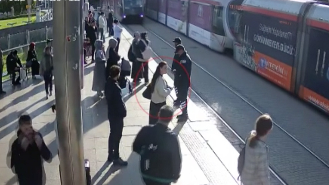Görüntüde, güvenlik görevlisinin kolundan tuttuğu yolcuyu geri çekerek tramvayın çarpmasını engellediği yer alıyor.
