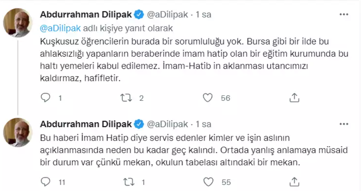 Yeni Akit yazarı Abdurrahman Dilipak da konuya sosyal medya hesabından yaptığı paylaşımla tepki gösterdi. Dilipak, yaptığı paylaşımda "İmam Hatipde dansöz haberi ile ilgili yeni bilgi, aynı binada hem ilkokul hem imam hatip var, salonda ortak kullanım. Bu iş Osmanlının başşehrinde İHL ve İlköğretim aynı mekanda oluyor. İmam Hatip yönetimi aile birliği aklansa da, sonuçta bu ayıp, bu utanç devam ediyor" dedi.
