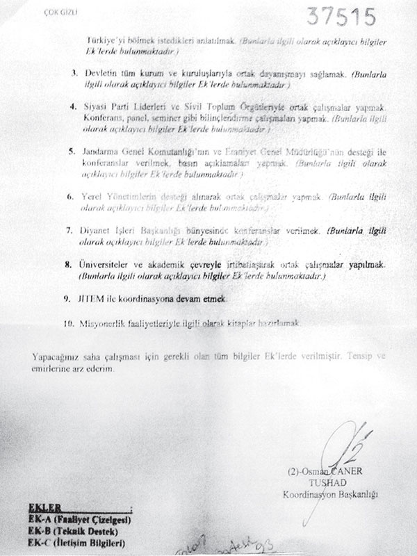 (...) MGK kararlarında misyonerlik faaliyetleri irtica ve bölücü tehditler sıralamasında 2. sırada yer almaktadır. Bu tehdit ortadan kaldırılıncaya kadar profesyonel bir çalışma yapılması ön görülmüştü.