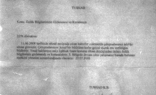 TUSHAD’dı ‘geri çekilin’ emri şöyle: “3276 Dikkatine: 11.06.2008 tarihinde ulusal medyada çıkan haberler sonrasında çalışmalarımız tehlike altına girmiştir. Çalışmalarımıza ikinci bir bildirime kadar geçici olarak ara verildiğini bildiririz. Yasal haklarınız saklı kalmak üzere koruma altına alındığından dolayı özlük bilgileriniz gizlenecek ve korunacaktır. 3. Bölgede devam eden çalışmanız burada bulunan merkezi yönetim sorumluluğunda olacaktır. 25. 07.2008”