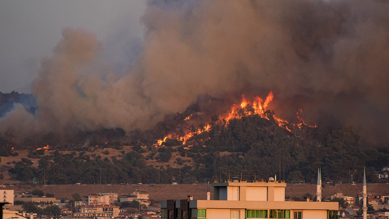İzmir Orman Bölge Müdürlüğüne bağlı hava ve kara araçları ile itfaiye ekiplerinin yangına müdahalesi sürüyor.
