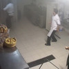 Panik halde koşuşturan görevlilerin sağ tarafta bulunan kapıdan dışarı çıktığı, bir süre sonra tamamen dumanla kaplanan mutfak bölümünün görünmez hale geldiği kayda geçiyor.