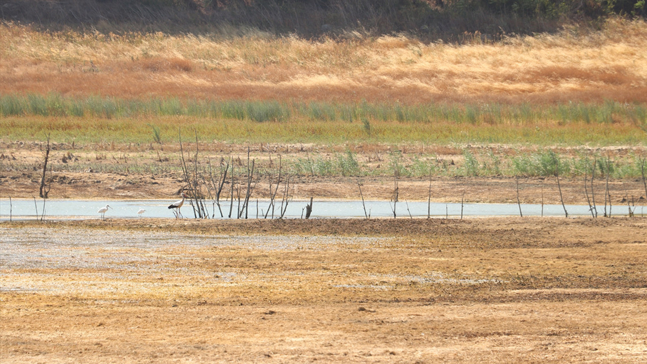 Tarımsal sulama amacıyla kullanılan gölette suyun çekildiği bölgelerde çatlaklar oluştu. Su çekilmesiyle ortaya çıkan alanlarda otlar ve çamur tabakası dikkati çekiyor.
