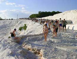 Pamukkale'ye bu yıl gelen turistler arasında Rusların birinci sırada yer aldığını belirten Korkmaz, ikinci sırada Alman, üçüncü sırada da Japon turistlerin olduğunu dile getirdi. Türkiye'ye ilk defa geldiklerini söyleyen Rus turistlerden Arkadij Aneretta (30) ile kız arkadaşı Kate Vysahorots (23), Pamukkale'nin ününü çok duyduklarını ve görmeyi çok arzu ettikleri için geldiklerini ifade etti. Pamukkale travertenlerinde bol bol hatıra fotoğrafı çektiren Rus turistler, beyaz cennete hayran kaldıklarını da dile getirdiler.