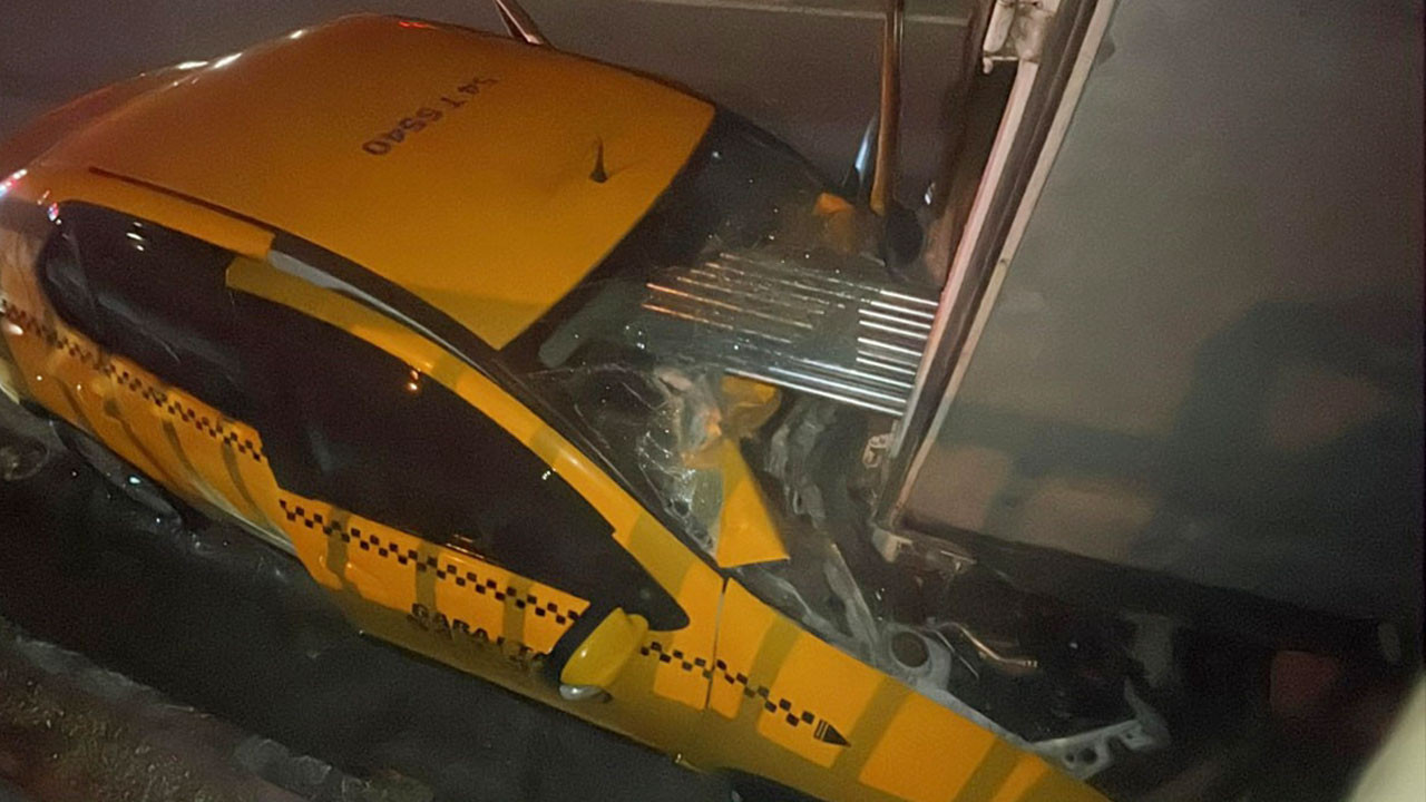 Çarpmanın şiddetiyle kamyonetteki demir su boruları taksinin camından içeri girdi.