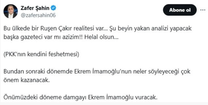 Devlet Bahçeli'nin öncülüğünde başlayan Terörsüz Türkiye sürecinde PKK’nın silah bırakması tarihi bir dönüm noktası olurken, gazeteci Ruşen Çakır sürecin yeni siyasal aktörünün Ekrem İmamoğlu olabileceğini savundu. Zafer Şahin ise Çakır’ın bu yorumunu “beyin yakan analiz” olarak değerlendirdi.