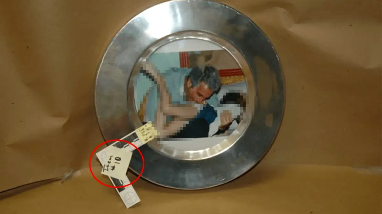 Paylaşılan görselde, bir kanıt masası üzerinde duran gümüş bir çerçeve görülüyor. Çerçevenin içindeki fotoğrafta: Jeffrey Epstein, küçük bir çocuğu kucağında tutarken veya ona çok yakın bir mesafede görülüyor. Fotoğraftaki çocuk, Epstein'ın kucağında veya hemen yanında oturuyor; basına sızan bazı analizlerde Epstein'ın çocuğun bacağını ısırır gibi yaptığı veya şakalaştığı anın dondurulduğu iddia ediliyor.