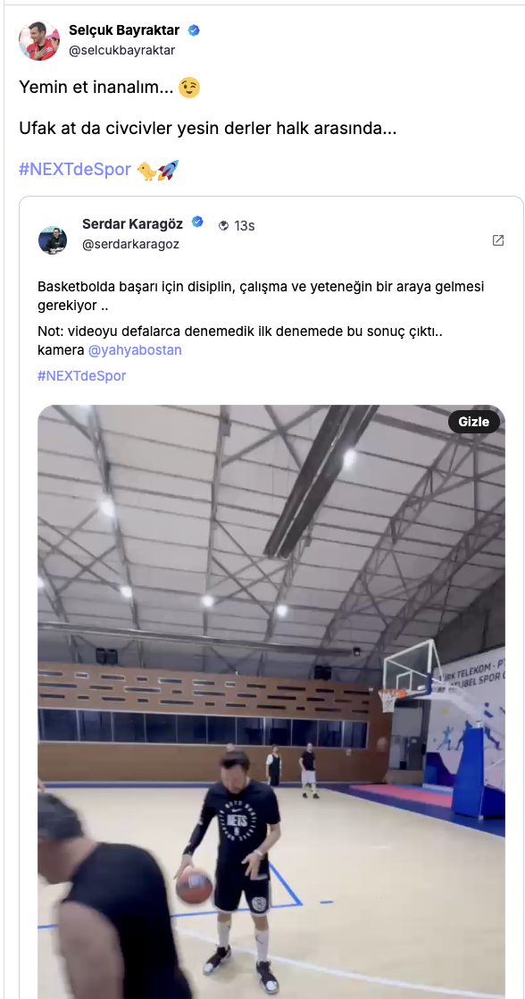 Basketbol sahasında müthiş bir 3'lük atan Anadolu Ajansı Genel Müdürü Serdar Karagöz, o anları milli sosyal medya platformu Next Sosyal'de paylaştı. Karagöz'ün basket atışı Selçuk Bayraktar'ı da şaşırttı.