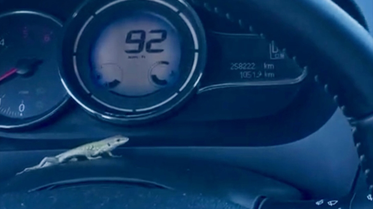 Abone olİşe gitmek için dün D-100 kara yolunda otomobiliyle seyir halinde olan Derya Karaaslan (37), direksiyon ile hız göstergesi panelinin arasında kertenkele olduğunu gördü.