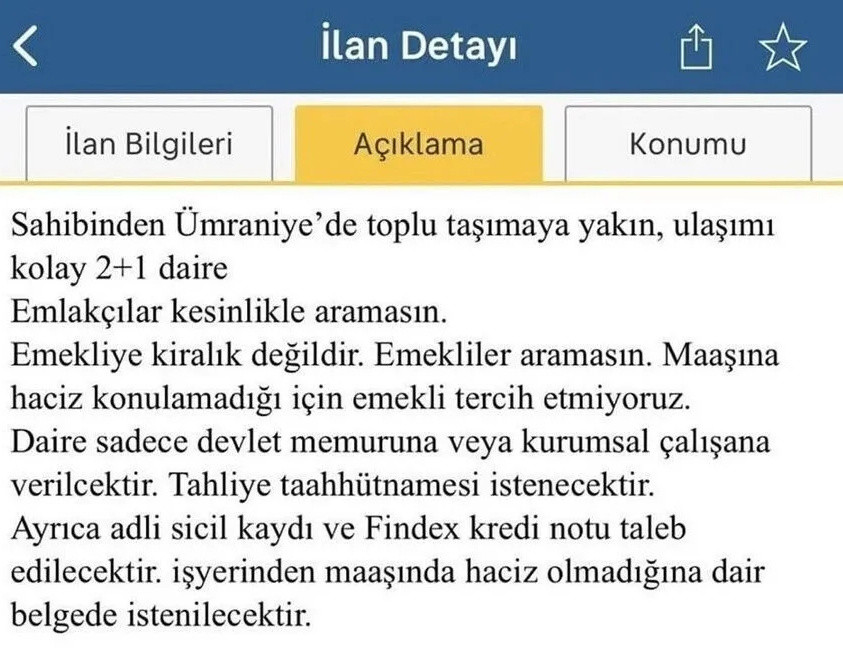Ümraniye’de bir 2+1 daire için verilen kiralık ilanında, “Emekliye kiralık değildir. Emekliler aramasın” ifadeleri yer aldı. Ev sahibi sadece devlet memurları veya kurumsal çalışanları kabul ederken, kiracılardan tahliye taahhütnamesi, adli sicil kaydı ve Findeks kredi notu istedi. İlan sosyal medyada tepki çekti