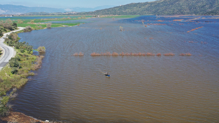 Aydın'ın Söke ilçesinde Büyük Menderes Nehri ile çevredeki derelerin taşması sonucu su altında kalan tarım arazilerinde çiftçiler ve balıkçılar balık avladı.