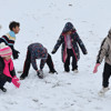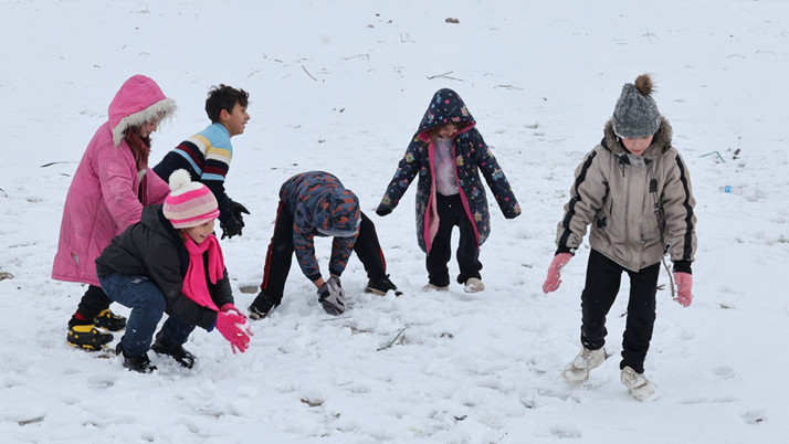 Beyaza bürünen Rakka'nın Tel Abyad ilçesinde, soğuk havaya aldırış etmeyen çocuklar, kardan adam yaptı, kartopu oynayarak doyasıya eğlenmeye çalıştı.